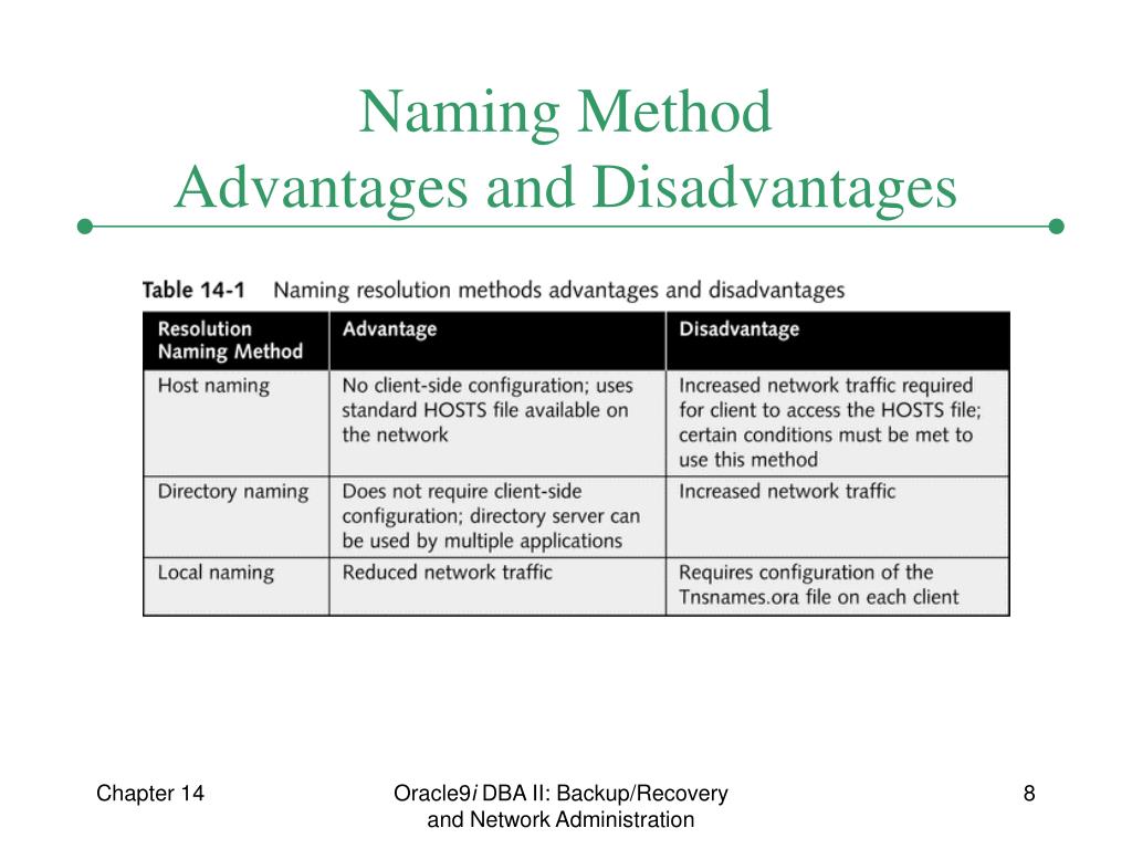 Naming Method Advantages and Disadvantages Oracle9i DBA II: Backup/Recovery and Network Administration