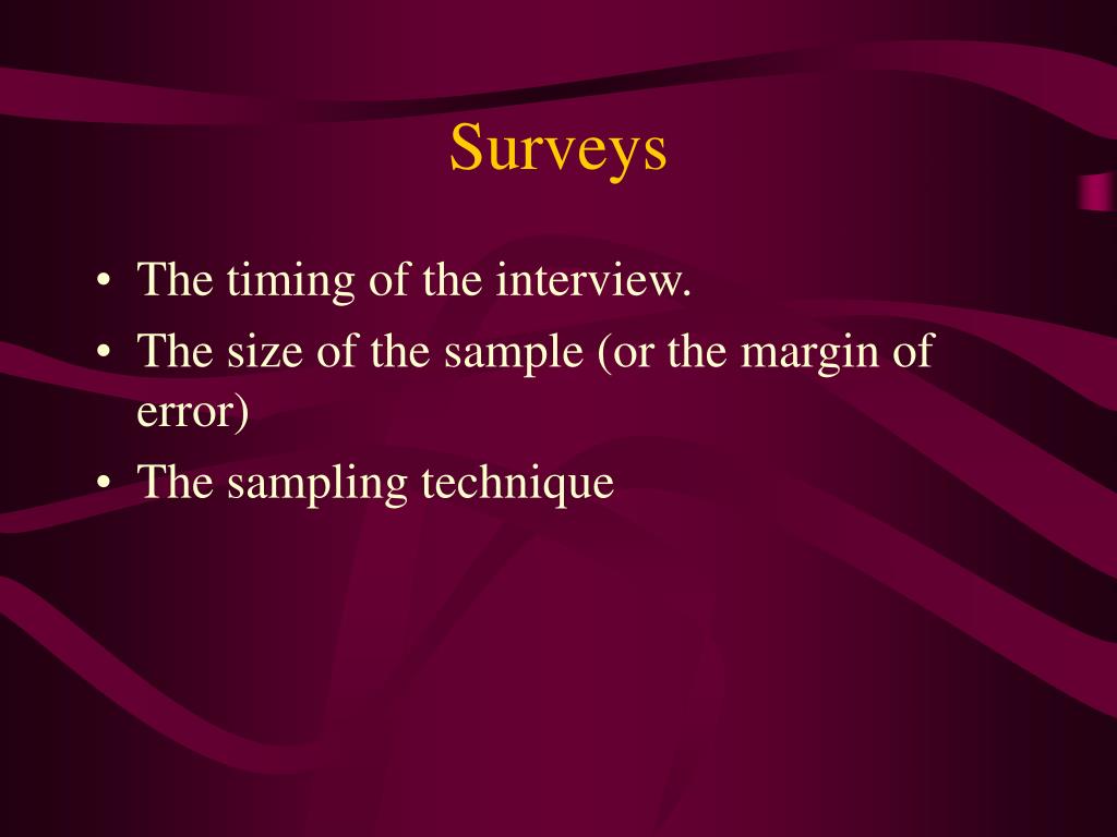 Surveys • The timing of the interview. • The size of the sample (or the margin of error) • The sampling technique