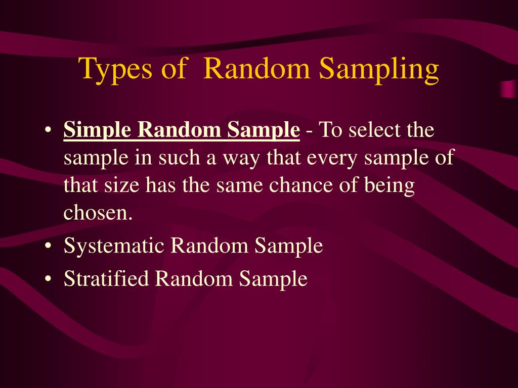 Types of Random Sampling • Simple Random Sample - To select the sample in such a way that every sample of that size has the same chance of being chosen. • Systematic Random Sample • Stratified Random Sample