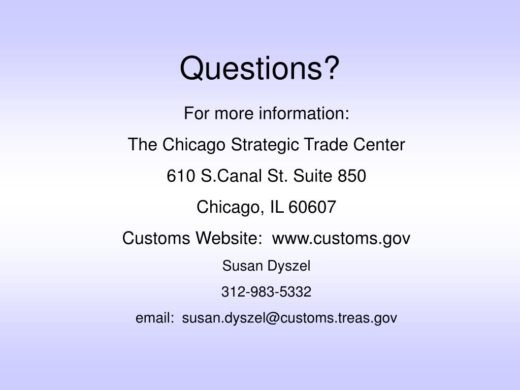 Questions? For more information: The Chicago Strategic Trade Center 610 S.Canal St. Suite 850 Chicago, IL 60607 Customs Website: www.customs.gov Susan Dyszel 312-983-5332 email: susan.dyszel@customs.treas.gov