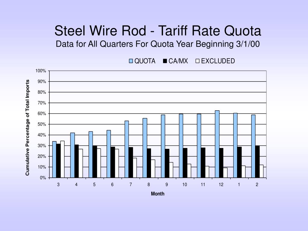 Steel Wire Rod Quota Update. Presentation for the American Wire Producers Association February 26, 2002 U.S. Customs Service Steel Monitoring Center Chicago. Steel Wire Rod TRQ of 2000. Quota year was divided into quarters with assigned quota for first three quarters.