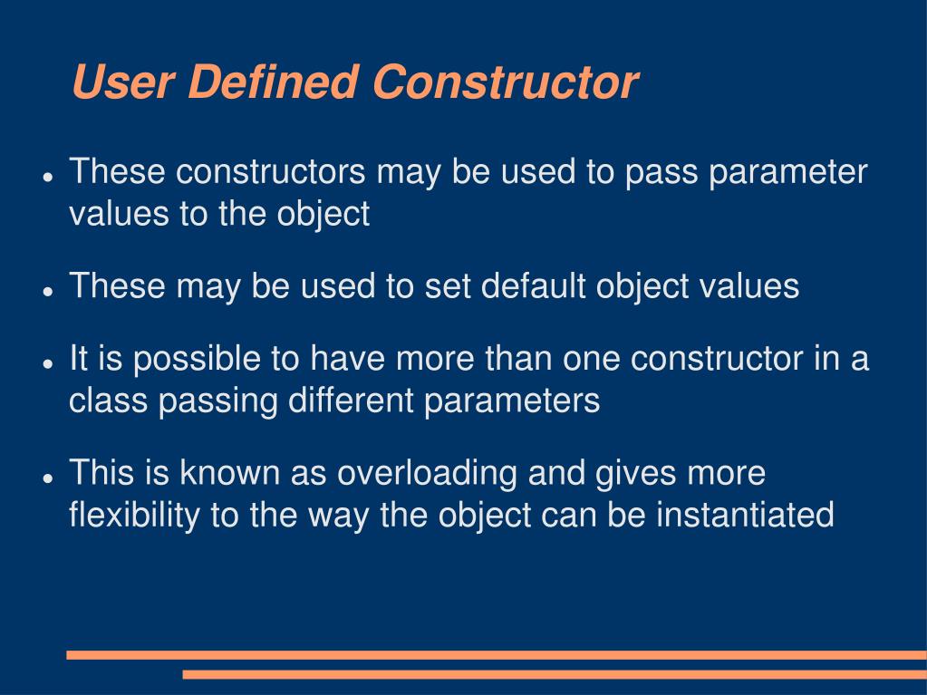 User Defined Constructor These constructors may be used to pass parameter values to the object These may be used to set default object values It is possible to have more than one constructor in a class passing different parameters This is known as overloading and gives more flexibility to the way the object can be instantiated