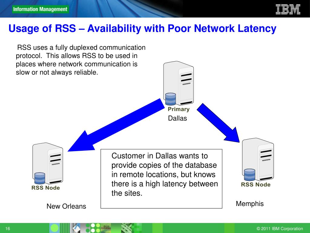 Usage of RSS – Availability with Poor Network Latency RSS uses a fully duplexed communication protocol. This allows RSS to be used in places where network communication is slow or not always reliable. Dallas Customer in Dallas wants to provide copies of the database in remote locations, but knows there is a high latency between the sites. Memphis New Orleans
