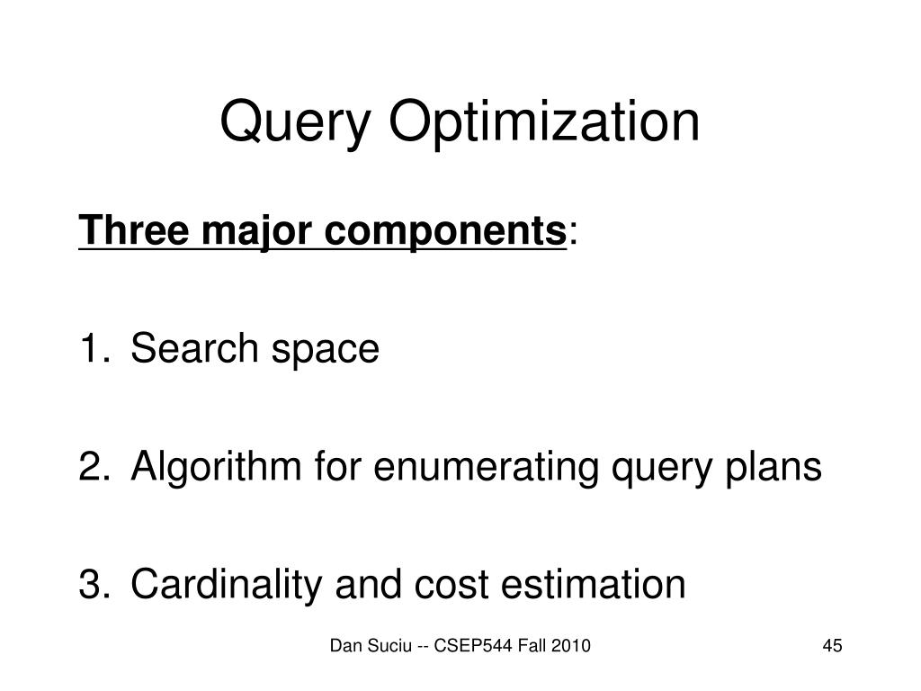 Query Optimization Three major components: • Search space • Algorithm for enumerating query plans • Cardinality and cost estimation Dan Suciu -- CSEP544 Fall 2010