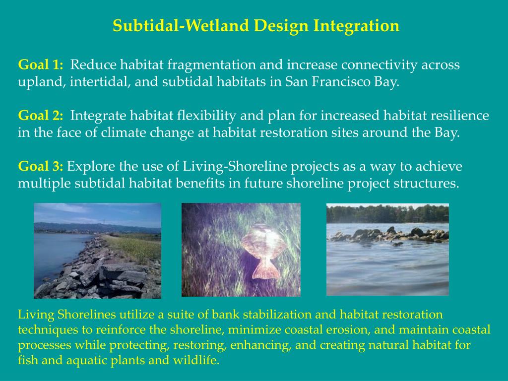 Subtidal-Wetland Design Integration Goal 1: Reduce habitat fragmentation and increase connectivity across upland, intertidal, and subtidal habitats in San Francisco Bay. Goal 2: Integrate habitat flexibility and plan for increased habitat resilience in the face of climate change at habitat restoration sites around the Bay. Goal 3: Explore the use of Living-Shoreline projects as a way to achieve multiple subtidal habitat benefits in future shoreline project structures. Living Shorelines utilize a suite of bank stabilization and habitat restoration techniques to reinforce the shoreline, minimize coastal erosion, and maintain coastal processes while protecting, restoring, enhancing, and creating natural habitat for fish and aquatic plants and wildlife.