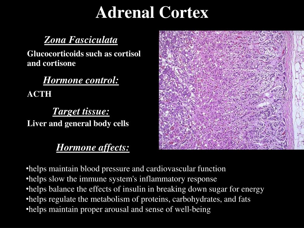 Adrenal Cortex Zona Fasciculata Glucocorticoids such as cortisol and cortisone Hormone control: ACTH Target tissue: Liver and general body cells • Hormone affects: • helps maintain blood pressure and cardiovascular function • helps slow the immune system's inflammatory response • helps balance the effects of insulin in breaking down sugar for energy • helps regulate the metabolism of proteins, carbohydrates, and fats • helps maintain proper arousal and sense of well-being