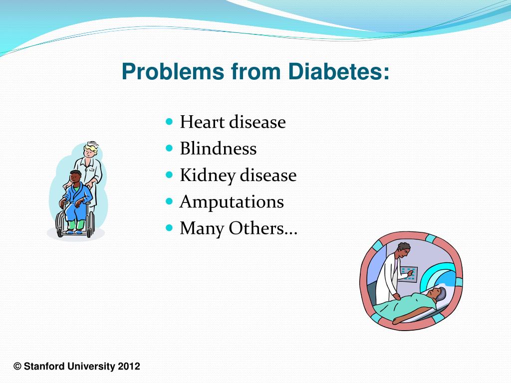 Problems from Diabetes: • Heart disease • Blindness • Kidney disease • Amputations • Many Others...