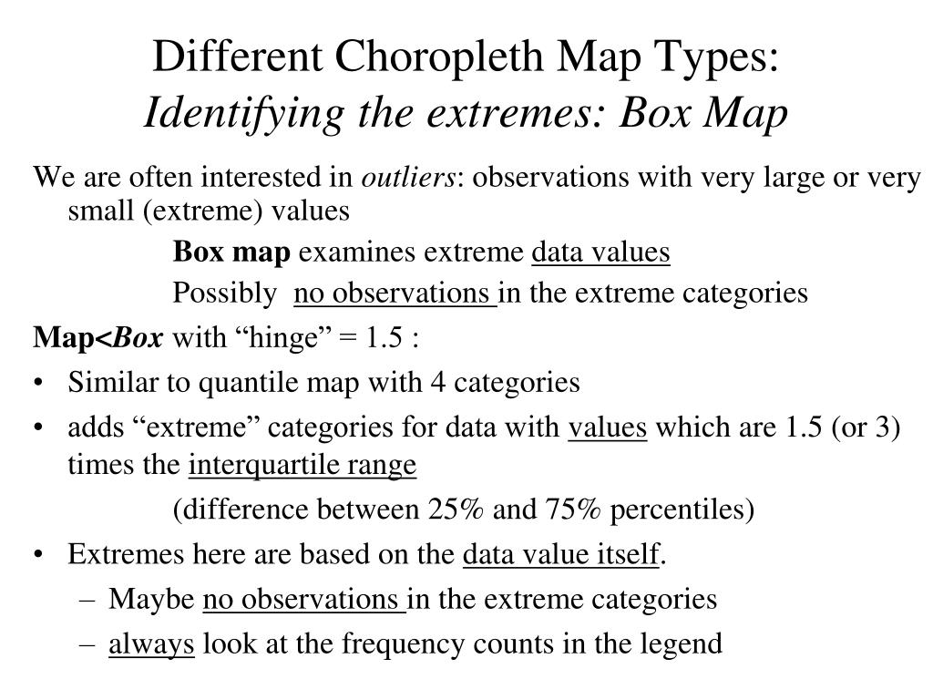Different Choropleth Map Types:Identifying the extremes: Box Map We are often interested in outliers: observations with very large or very small (extreme) values Box map examines extreme data values Possibly no observations in the extreme categories Map<Box with “hinge” = 1.5 : • Similar to quantile map with 4 categories • adds “extreme” categories for data with values which are 1.5 (or 3) times the interquartile range (difference between 25% and 75% percentiles) • Extremes here are based on the data value itself. • Maybe no observations in the extreme categories • always look at the frequency counts in the legend