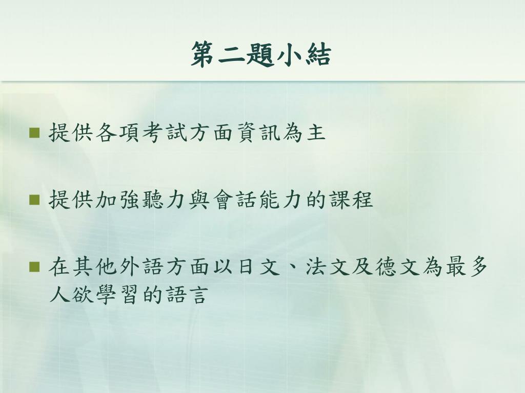 第二題小結 • 提供各項考試方面資訊為主 • 提供加強聽力與會話能力的課程 • 在其他外語方面以日文、法文及德文為最多人欲學習的語言