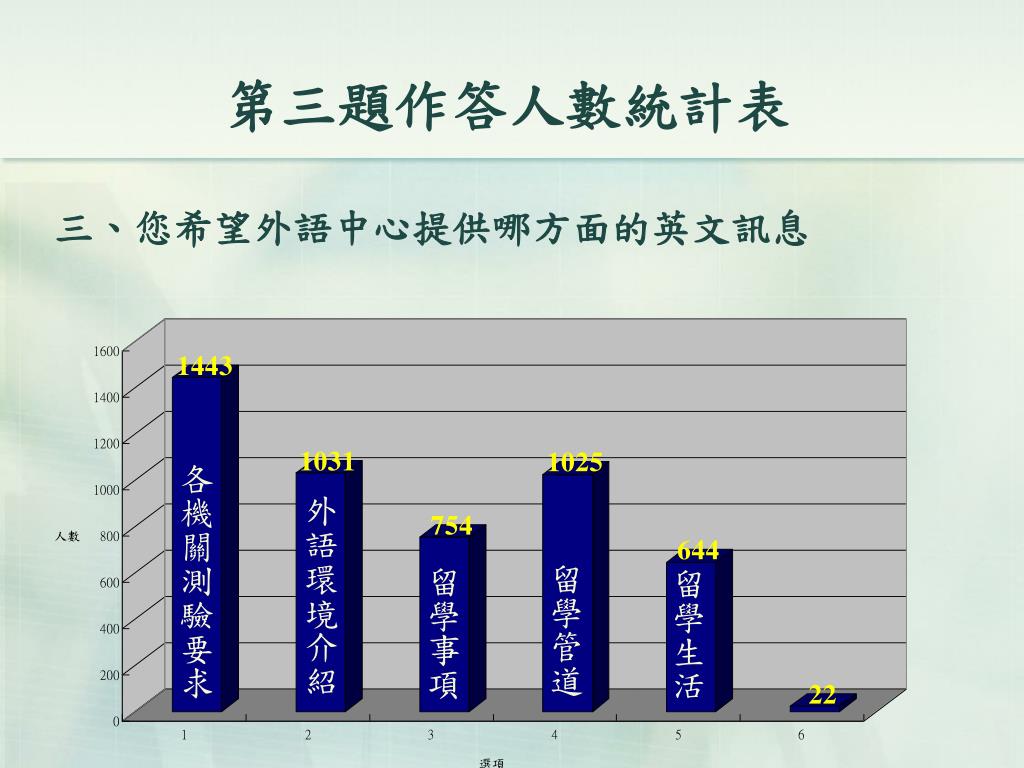 第三題作答人數統計表 三、您希望外語中心提供哪方面的英文訊息 各機關測驗要求 外語環境介紹 留學管道 留學事項 留學生活