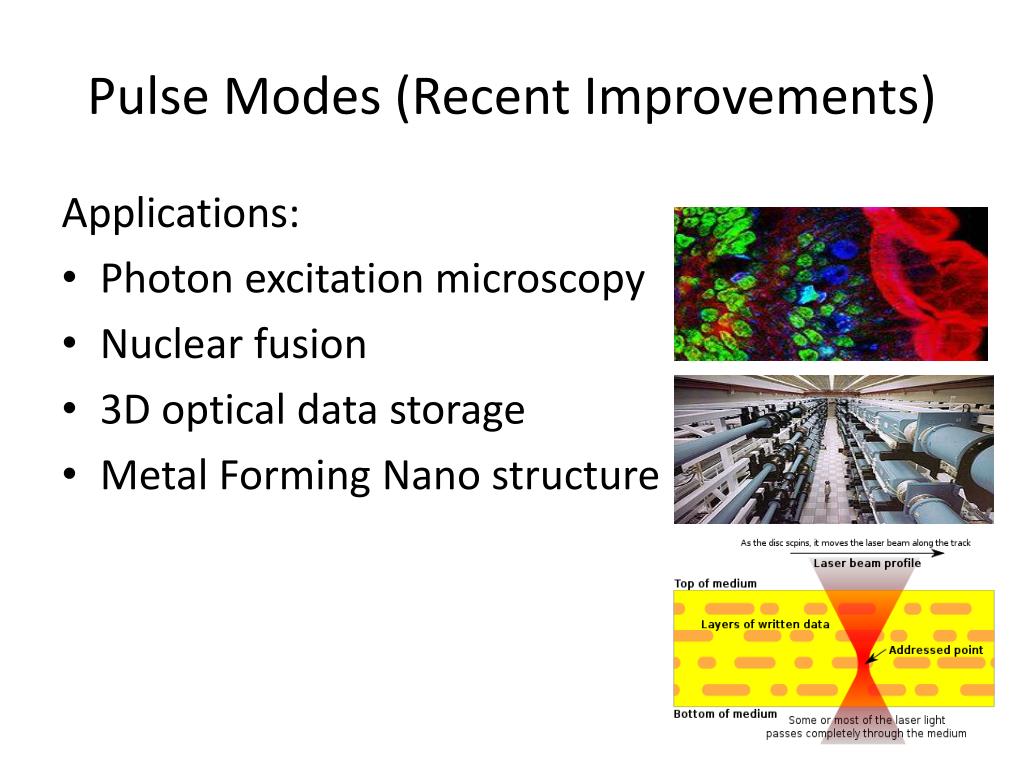 Pulse Modes (Recent Improvements) Applications: • Photon excitation microscopy • Nuclear fusion • 3D optical data storage • Metal Forming Nano structure