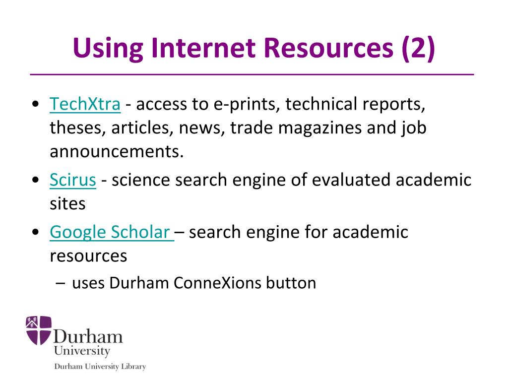 Using Internet Resources (2) • TechXtra - access to e-prints, technical reports, theses, articles, news, trade magazines and job announcements. • Scirus - science search engine of evaluated academic sites • Google Scholar – search engine for academic resources • uses Durham ConneXions button