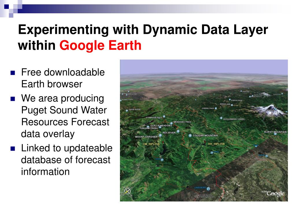 Experimenting with Dynamic Data Layer within Google Earth • Free downloadable Earth browser • We area producing Puget Sound Water Resources Forecast data overlay • Linked to updateable database of forecast information