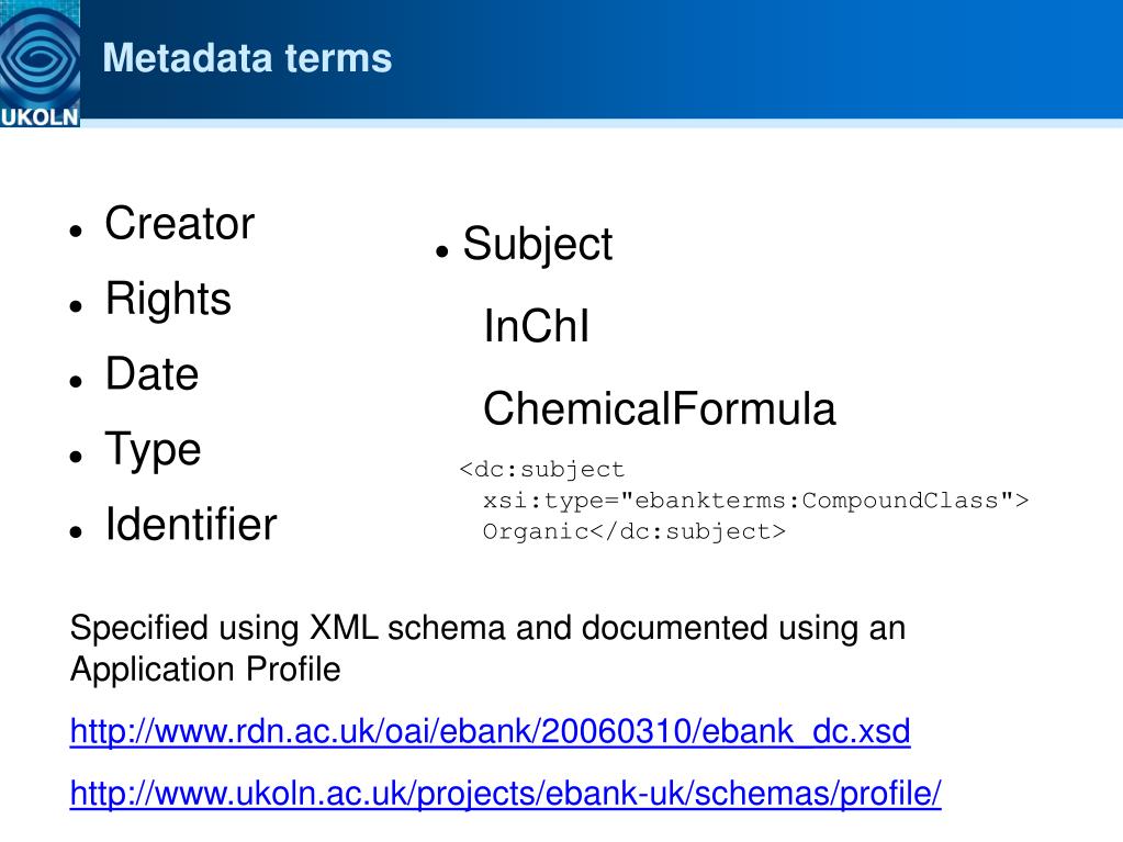 Metadata terms • Creator • Rights • Date • Type • Identifier • Subject • InChI • ChemicalFormula • <dc:subject xsi:type="ebankterms:CompoundClass">Organic</dc:subject> Specified using XML schema and documented using an Application Profile http://www.rdn.ac.uk/oai/ebank/20060310/ebank_dc.xsd http://www.ukoln.ac.uk/projects/ebank-uk/schemas/profile/