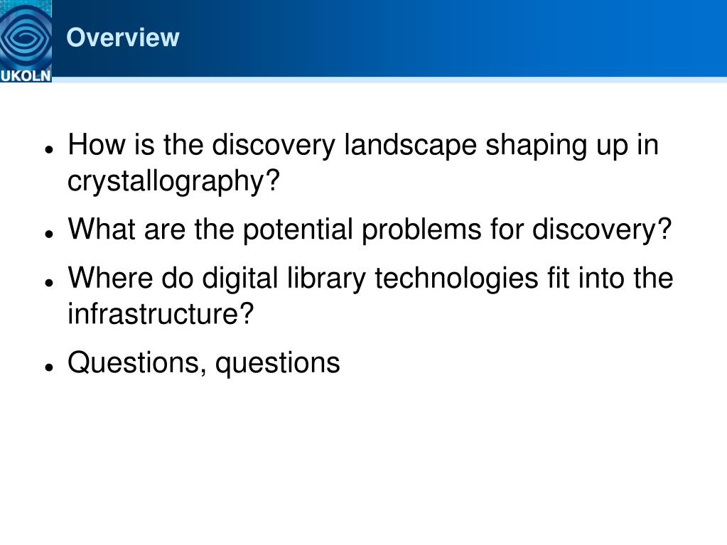 Overview • How is the discovery landscape shaping up in crystallography? • What are the potential problems for discovery? • Where do digital library technologies fit into the infrastructure? • Questions, questions