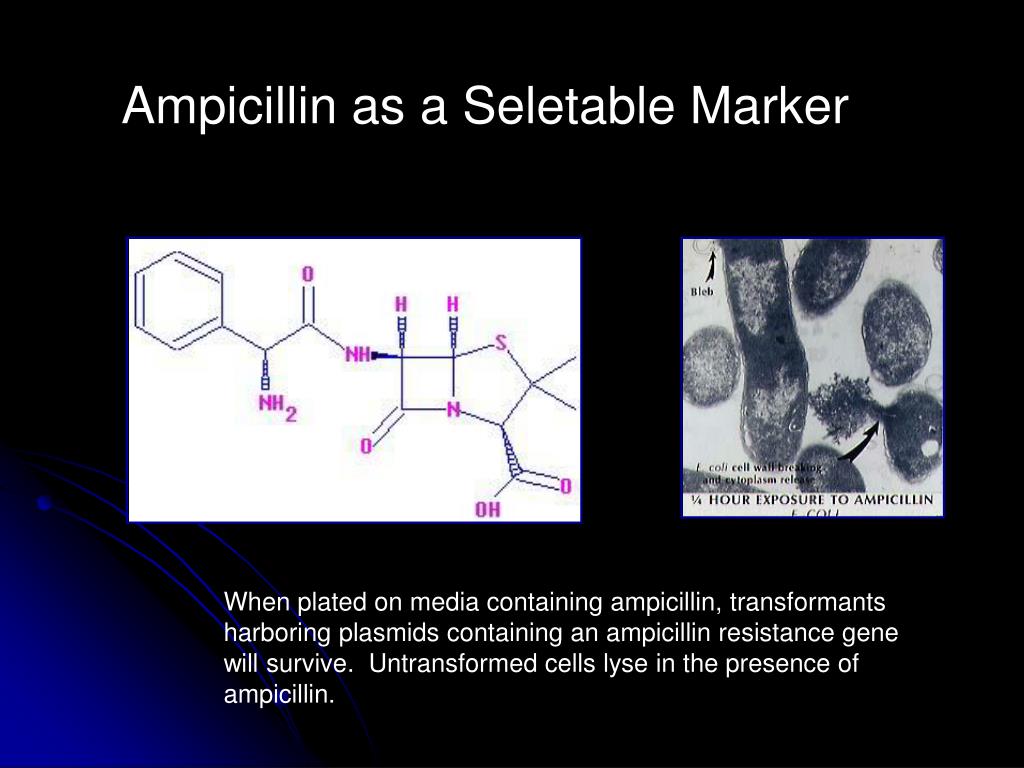 Ampicillin as a Seletable Marker When plated on media containing ampicillin, transformants harboring plasmids containing an ampicillin resistance gene will survive. Untransformed cells lyse in the presence of ampicillin.