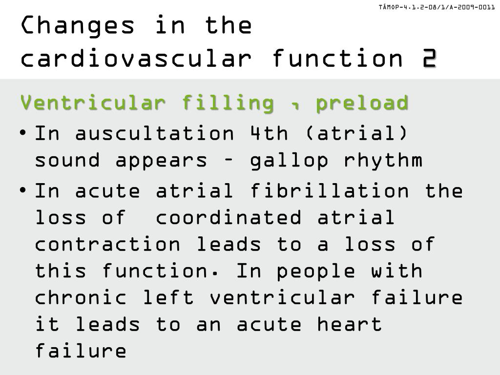 Changes in the cardiovascular function2 • Ventricular filling , preload • In auscultation 4th (atrial) sound appears – gallop rhythm • In acute atrial fibrillation the loss of coordinated atrial contraction leads to a loss of this function. In people with chronicleft ventricular failure it leads to an acute heart failure