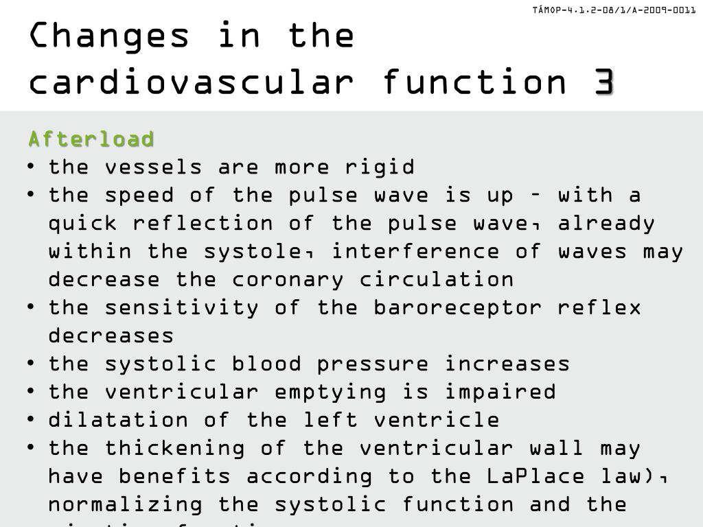 Changes in the cardiovascular function3 • Afterload • the vessels are more rigid • the speed of the pulse wave is up – with a quick reflection ofthe pulse wave, already within the systole, interferenceof waves may decrease the coronary circulation • the sensitivity of the baroreceptor reflex decreases • the systolic blood pressure increases • the ventricular emptying is impaired • dilatation of the left ventricle • the thickening of the ventricular wall may havebenefits according to the LaPlace law),normalizing the systolic function and the ejectionfraction In case of an abnormal blood pressure, treatment is necessary – isolatedsystolic hypertension