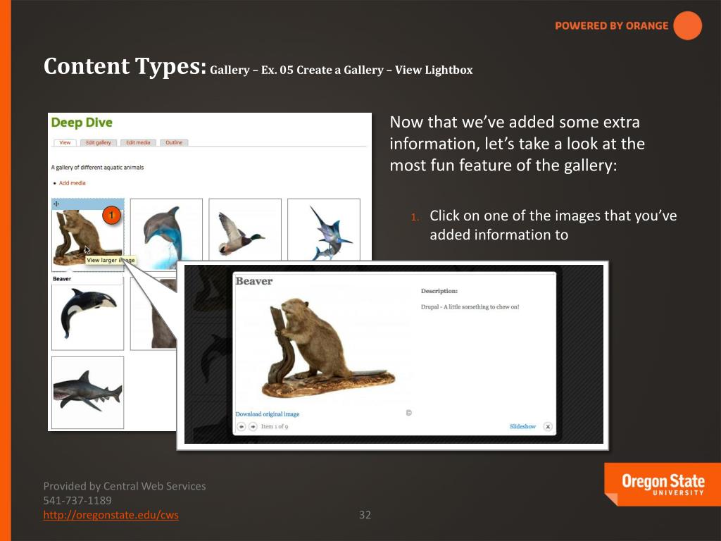 Content Types: Gallery – Ex. 05 Create a Gallery – View Lightbox Now that we’ve added some extra information, let’s take a look at the most fun feature of the gallery: • Click on one of the images that you’ve added information to 1