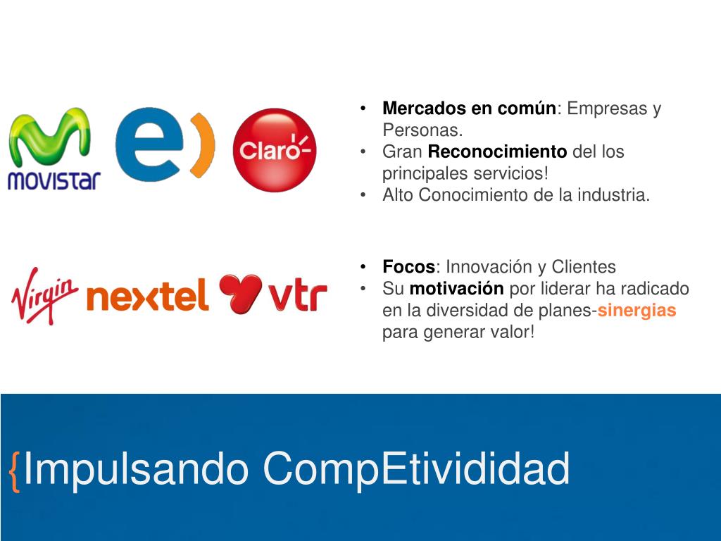 Mercados en común: Empresas y Personas. • Gran Reconocimientodel los principales servicios! • Alto Conocimiento de la industria. • Focos: Innovación y Clientes • Su motivación por liderar ha radicado en la diversidad de planes-sinergiaspara generar valor! {Impulsando CompEtivididad