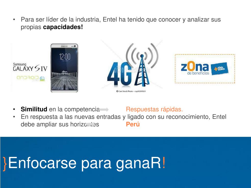 Para ser líder de la industria, Entel ha tenido que conocer y analizar sus propias capacidades! • Similitud en la competencia Respuestas rápidas. • En respuesta a las nuevas entradas y ligado con su reconocimiento, Entel debe ampliar sus horizontes Perú }Enfocarse para ganaR!