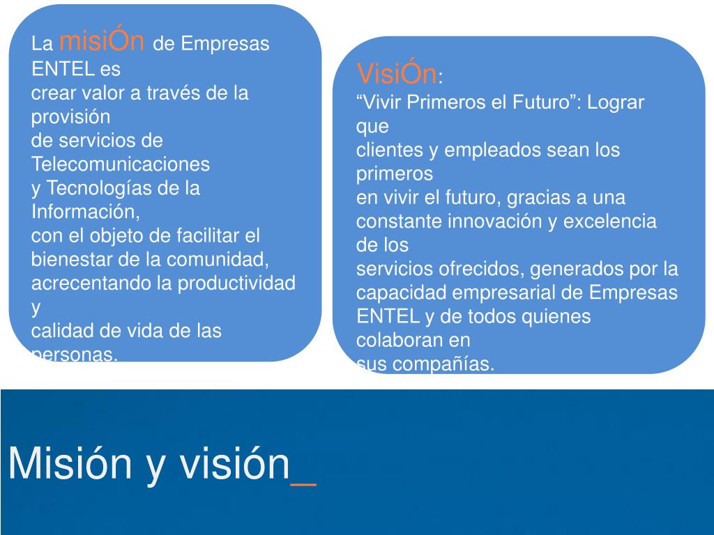 LamisiÓnde Empresas ENTEL es crear valor a través de la provisión de servicios de Telecomunicaciones y Tecnologías de la Información, con el objeto de facilitar el bienestar de la comunidad, acrecentando la productividad y calidad de vida de las personas. VisiÓn: “Vivir Primeros el Futuro”: Lograr que clientes y empleados sean los primeros en vivir el futuro, gracias a una constante innovación y excelencia de los servicios ofrecidos, generados por la capacidad empresarial de Empresas ENTEL y de todos quienes colaboran en sus compañías. Misión y visión_