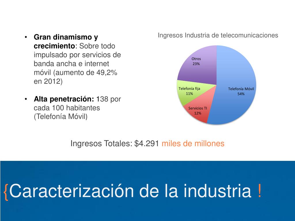 Gran dinamismo y crecimiento: Sobre todo impulsado por servicios de banda ancha e internet móvil (aumento de 49,2% en 2012) • Alta penetración: 138 por cada 100 habitantes (Telefonía Móvil) Ingresos Totales: $4.291 miles de millones {Caracterización de la industria !