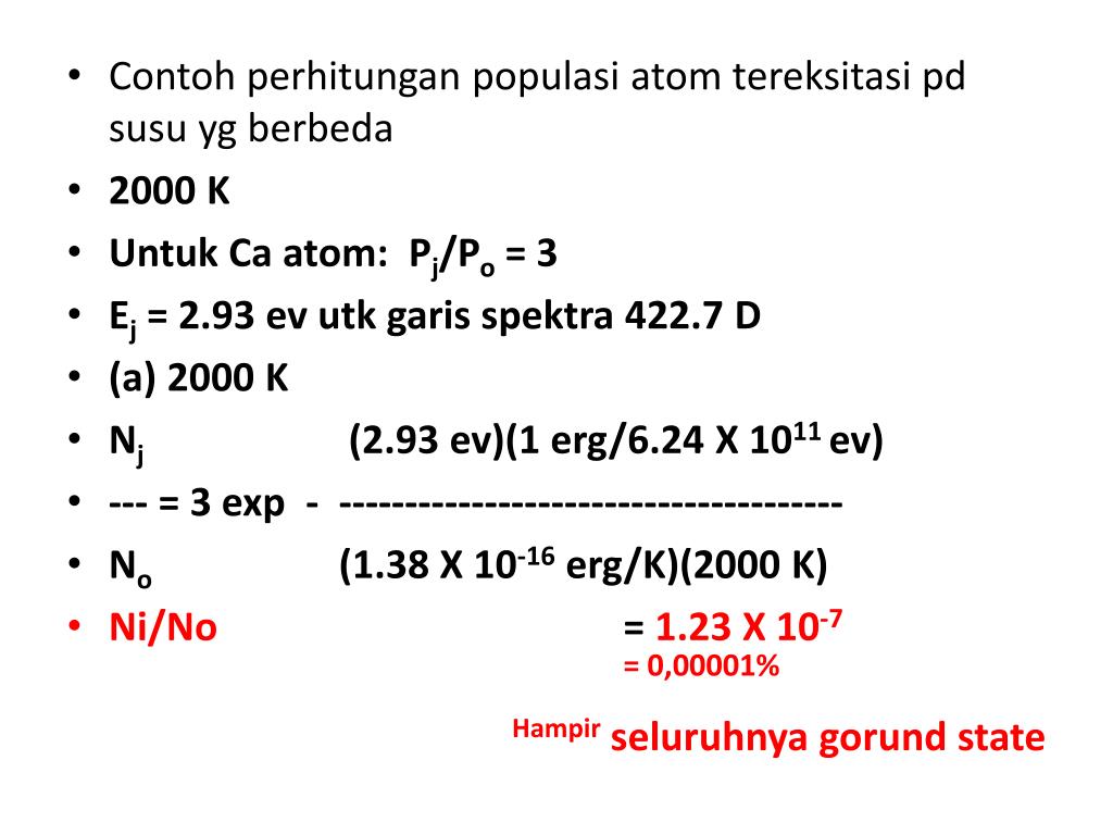 Contoh perhitungan populasi atom tereksitasi pd susu yg berbeda • 2000 K • Untuk Ca atom: Pj/Po = 3 • Ej = 2.93 evutkgaris spektra 422.7 D • (a) 2000 K • Nj (2.93 ev)(1 erg/6.24 X 1011 ev) • --- = 3 exp - -------------------------------------- • No (1.38 X 10-16 erg/K)(2000 K) • Ni/No = 1.23 X 10-7 = 0,00001% Hampir seluruhnya gorund state