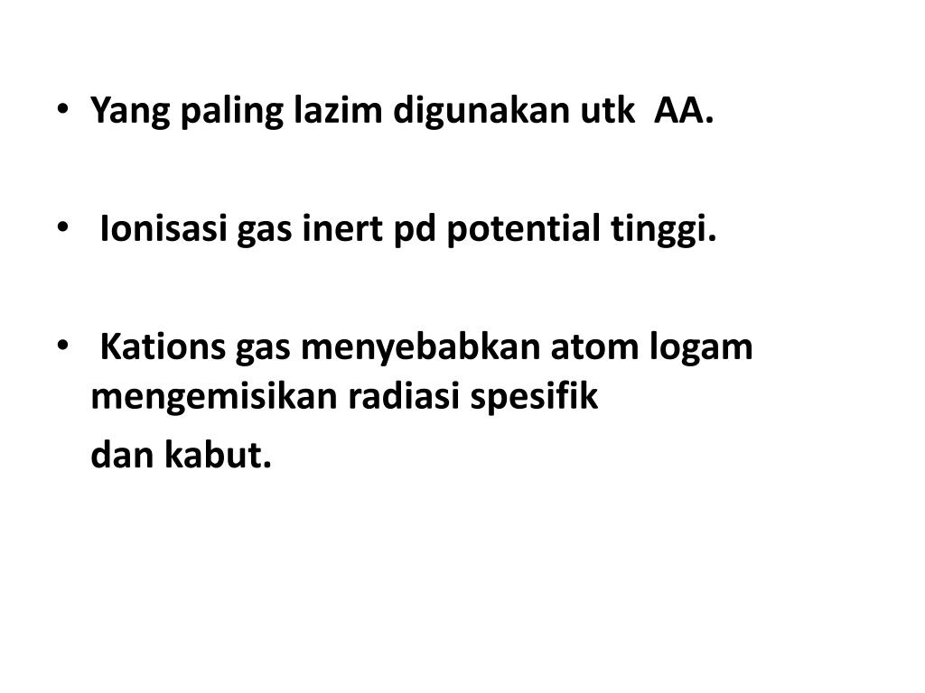 Yang paling lazim digunakan utk AA. • Ionisasi gas inert pd potential tinggi. • Kationsgas menyebabkan atom logam mengemisikan radiasi spesifik dan kabut.