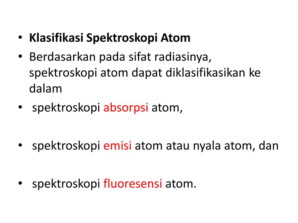KlasifikasiSpektroskopi Atom • Berdasarkanpadasifatradiasinya, spektroskopi atom dapatdiklasifikasikankedalam • spektroskopiabsorpsiatom, • spektroskopiemisi atom ataunyala atom, dan • spektroskopifluoresensi atom.
