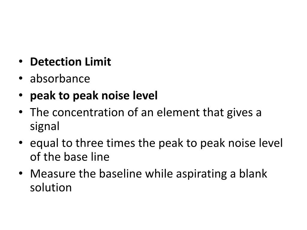 Detection Limit • absorbance • peak to peak noise level • The concentration of an element that gives a signal • equal to three times the peak to peak noise level of the base line • Measure the baseline while aspirating a blank solution