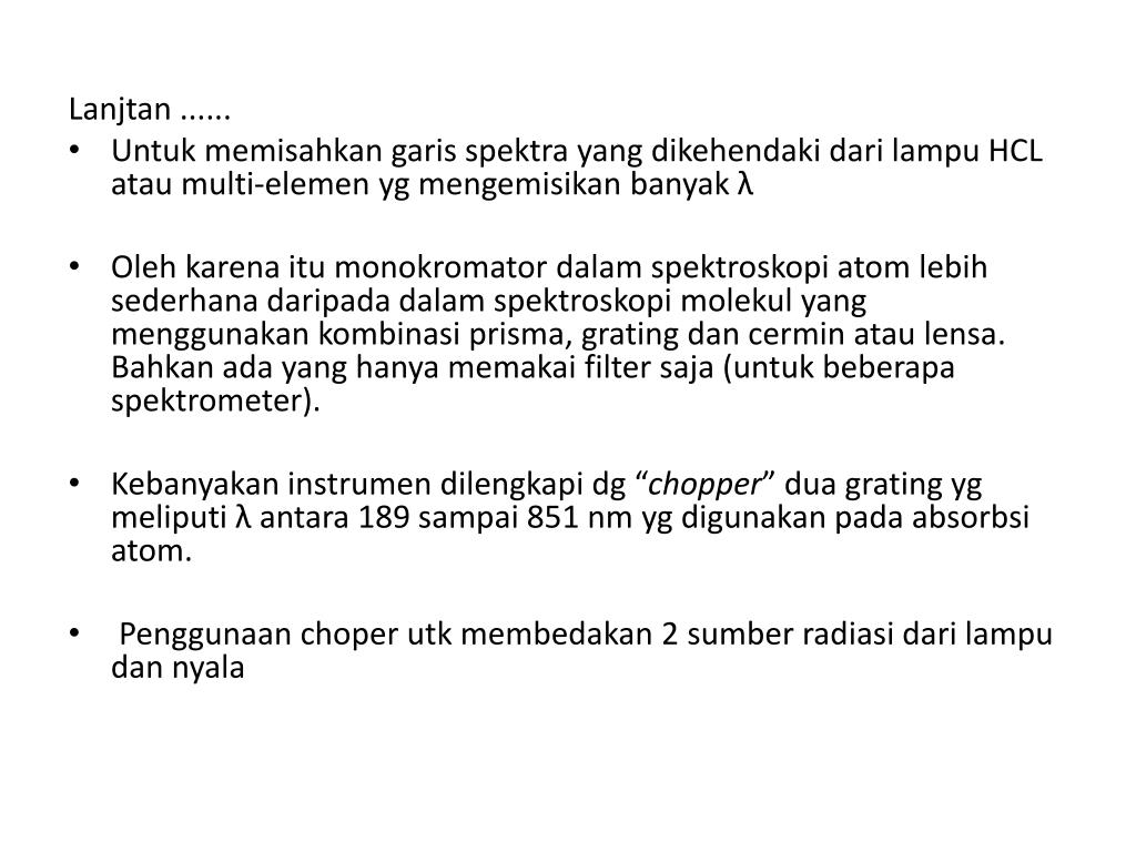 Lanjtan ...... • Untuk memisahkan garis spektra yang dikehendaki dari lampu HCL atau multi-elemen yg mengemisikan banyak λ • Olehkarenaitumonokromatordalamspektroskopi atom lebihsederhanadaripadadalamspektroskopimolekul yang menggunakankombinasiprisma, grating dancerminataulensa. Bahkanada yang hanyamemakai filter saja (untukbeberapaspektrometer). • Kebanyakan instrumen dilengkapi dg “chopper” dua grating yg meliputi λ antara 189 sampai 851 nm yg digunakan pada absorbsi atom. • Penggunaan choper utk membedakan 2 sumber radiasi dari lampu dan nyala