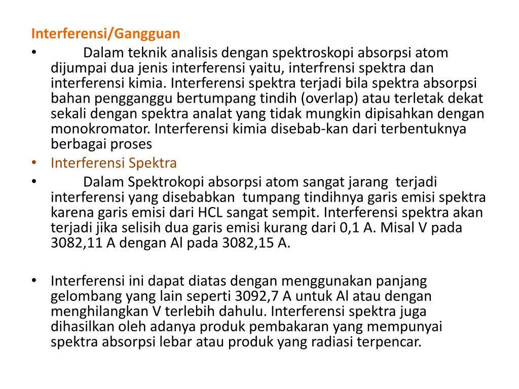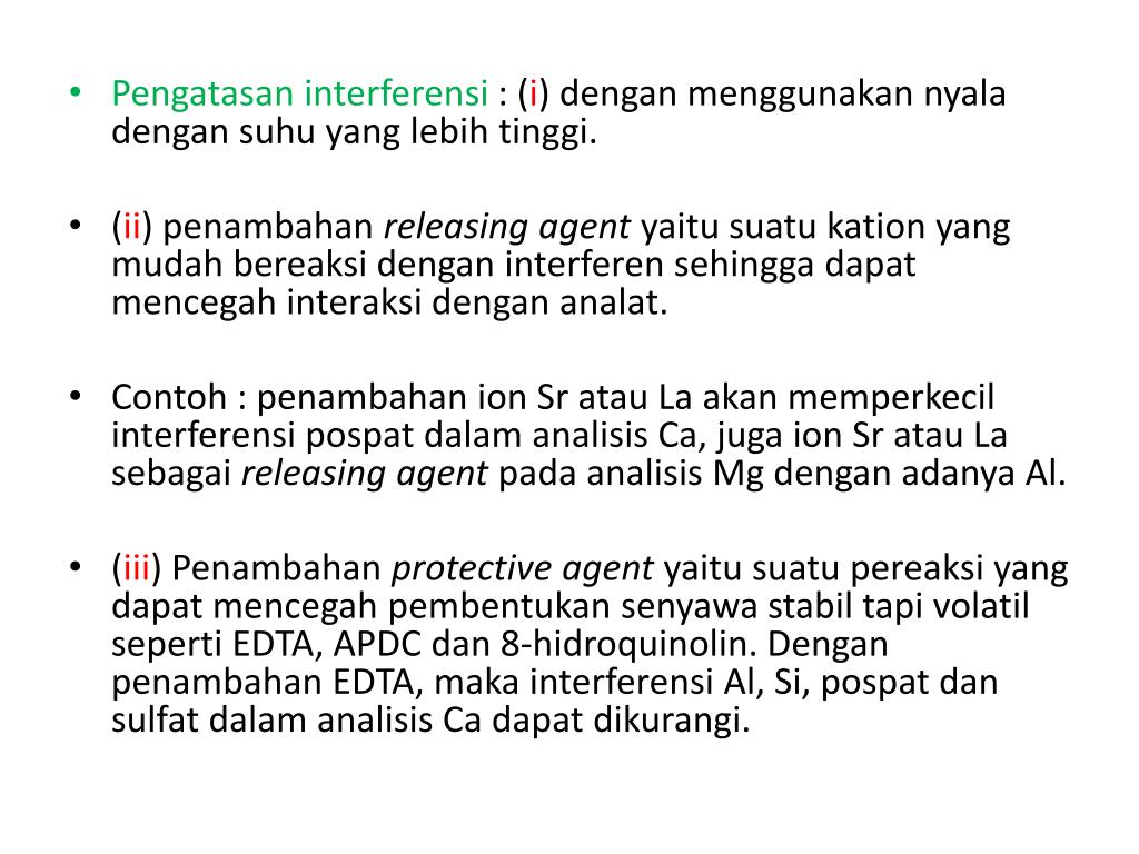 Pengatasan interferensi :(i) denganmenggunakannyaladengansuhu yang lebihtinggi. • (ii) penambahanreleasing agentyaitusuatukation yang mudahbereaksidenganinterferensehinggadapatmencegahinteraksidengananalat. • Contoh : penambahan ion Sratau La akanmemperkecilinterferensipospatdalamanalisis Ca, juga ion Sratau La sebagaireleasing agentpadaanalisis Mg denganadanya Al. • (iii) Penambahanprotective agentyaitusuatupereaksi yang dapatmencegahpembentukansenyawastabiltapivolatilseperti EDTA, APDC dan 8-hidroquinolin. Denganpenambahan EDTA, makainterferensi Al, Si, pospatdansulfatdalamanalisis Ca dapatdikurangi.