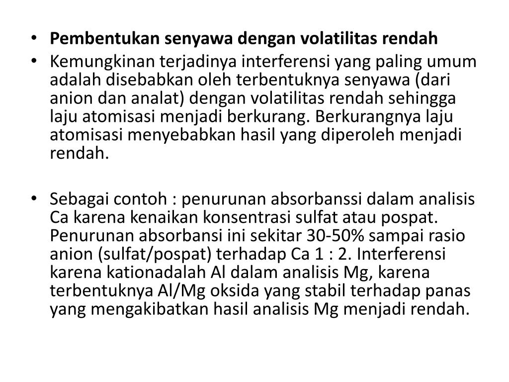 Pembentukansenyawadenganvolatilitasrendah • Kemungkinanterjadinyainterferensi yang paling umumadalahdisebabkanolehterbentuknyasenyawa (dari anion dananalat) denganvolatilitasrendahsehinggalajuatomisasimenjadiberkurang. Berkurangnyalajuatomisasimenyebabkanhasil yang diperolehmenjadirendah. • Sebagaicontoh : penurunanabsorbanssidalamanalisis Ca karenakenaikankonsentrasisulfatataupospat. Penurunanabsorbansiinisekitar 30-50% sampairasio anion (sulfat/pospat) terhadap Ca 1 : 2. Interferensikarenakationadalah Al dalamanalisis Mg, karenaterbentuknya Al/Mg oksida yang stabilterhadappanas yang mengakibatkanhasilanalisis Mg menjadirendah.