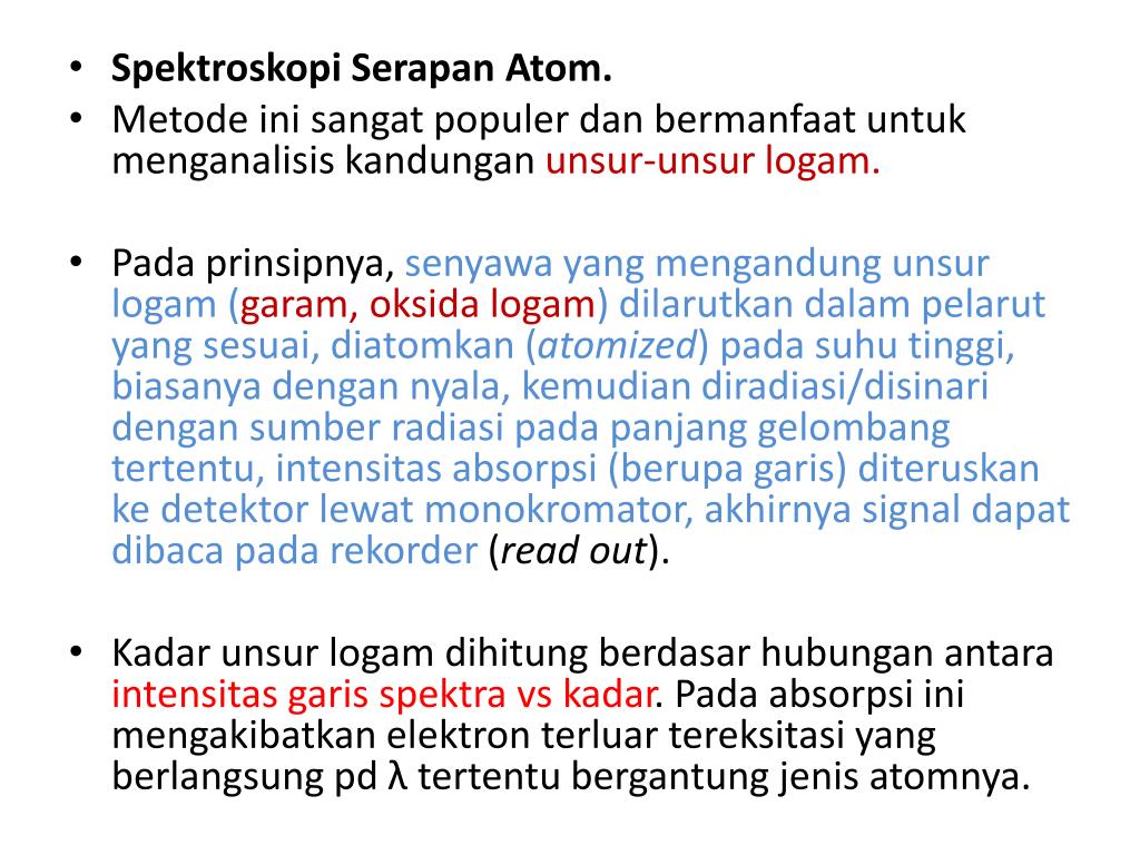 SpektroskopiSerapan Atom. • Metode ini sangat populer dan bermanfaat untuk menganalisis kandungan unsur-unsur logam. • Pada prinsipnya, senyawa yang mengandung unsur logam (garam, oksida logam) dilarutkan dalam pelarut yang sesuai, diatomkan (atomized) pada suhu tinggi, biasanya dengan nyala, kemudian diradiasi/disinari dengan sumber radiasi pada panjang gelombang tertentu, intensitas absorpsi (berupa garis) diteruskan ke detektor lewat monokromator, akhirnya signal dapat dibaca pada rekorder (read out). • Kadar unsur logam dihitung berdasar hubungan antara intensitas garis spektra vs kadar. Pada absorpsi ini mengakibatkan elektron terluar tereksitasi yang berlangsung pd λ tertentu bergantung jenis atomnya.