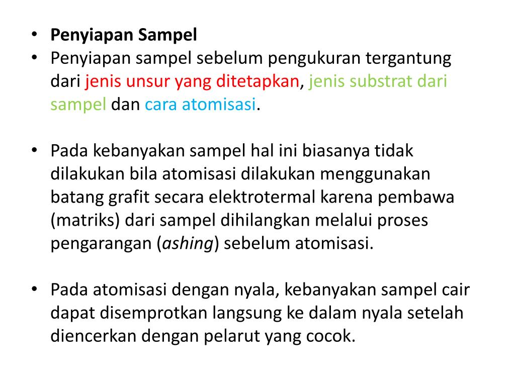 Penyiapan Sampel • Penyiapan sampel sebelum pengukuran tergantung dari jenis unsur yang ditetapkan, jenis substrat dari sampel dan cara atomisasi. • Pada kebanyakan sampel hal ini biasanya tidak dilakukan bila atomisasi dilakukan menggunakan batang grafit secara elektrotermal karena pembawa (matriks) dari sampel dihilangkan melalui proses pengarangan (ashing) sebelum atomisasi. • Pada atomisasi dengan nyala, kebanyakan sampel cair dapat disemprotkan langsung ke dalam nyala setelah diencerkan dengan pelarut yang cocok.
