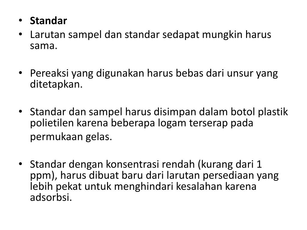 Standar • Larutan sampel dan standar sedapat mungkin harus sama. • Pereaksi yang digunakan harus bebas dari unsur yang ditetapkan. • Standar dan sampel harus disimpan dalam botol plastik polietilen karena beberapa logam terserap pada permukaan gelas. • Standar dengan konsentrasi rendah (kurang dari 1 ppm), harus dibuat baru dari larutan persediaan yang lebih pekat untuk menghindari kesalahan karena adsorbsi.
