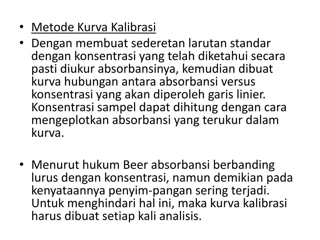 MetodeKurvaKalibrasi • Denganmembuatsederetanlarutanstandardengankonsentrasi yang telahdiketahuisecarapastidiukurabsorbansinya, kemudiandibuatkurvahubungan antaraabsorbansi versus konsentrasi yang akandiperolehgaris linier. Konsentrasisampeldapatdihitungdengancaramengeplotkanabsorbansi yang terukurdalamkurva. • Menuruthukum Beer absorbansiberbandinglurusdengankonsentrasi, namundemikianpadakenyataannyapenyim-panganseringterjadi. Untukmenghindarihalini,makakurvakalibrasiharusdibuatsetiap kali analisis.