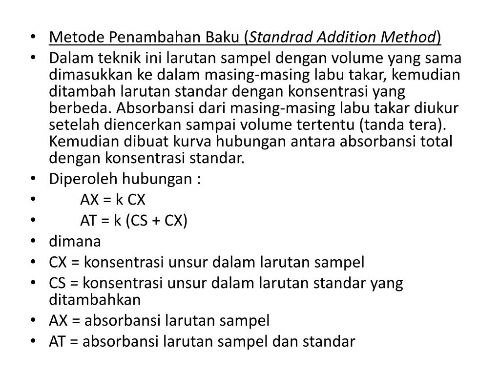 MetodePenambahanBaku(Standrad Addition Method) • Dalamteknikinilarutansampeldengan volume yang samadimasukkankedalammasing-masinglabutakar, kemudianditambahlarutanstandardengankonsentrasi yang berbeda. Absorbansidarimasing-masinglabutakardiukursetelahdiencerkansampai volume tertentu (tandatera). Kemudiandibuatkurvahubunganantaraabsorbansi total dengankonsentrasistandar. • Diperolehhubungan : • AX = k CX • AT = k (CS + CX) • dimana • CX = konsentrasiunsurdalamlarutansampel • CS = konsentrasiunsurdalamlarutanstandar yang ditambahkan • AX = absorbansilarutansampel • AT = absorbansilarutansampeldanstandar