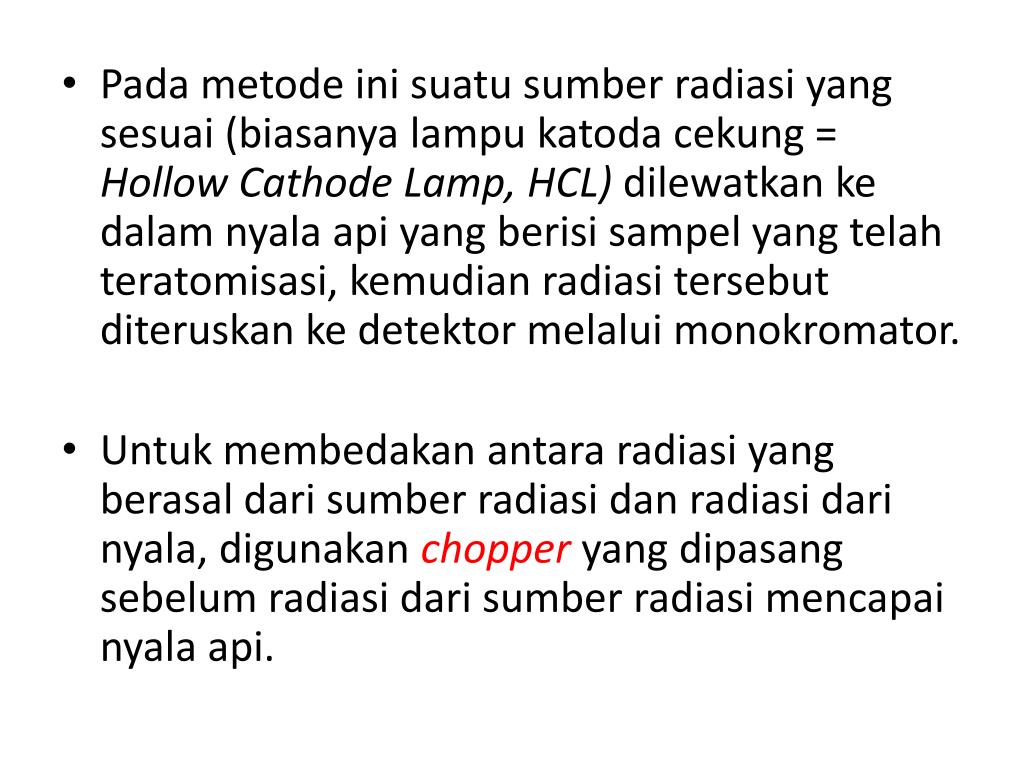 Padametodeinisuatusumberradiasi yang sesuai (biasanya lampukatodacekung = Hollow Cathode Lamp, HCL) dilewatkankedalamnyalaapi yang berisisampel yang telahteratomisasi, kemudianradiasitersebutditeruskankedetektormelaluimonokromator. • Untukmembedakanantararadiasi yang berasaldarisumberradiasidanradiasidarinyala, digunakanchopper yang dipasangsebelumradiasidarisumberradiasimencapainyalaapi.