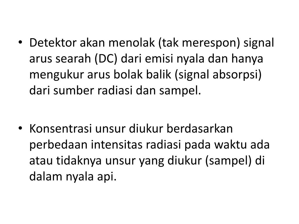 Detektorakanmenolak(tak merespon) signal arussearah (DC) dariemisinyaladanhanyamengukurarusbolakbalik (signal absorpsi) darisumberradiasidansampel. • Konsentrasiunsurdiukurberdasarkanperbedaanintensitasradiasipadawaktuadaatautidaknyaunsur yang diukur (sampel) didalamnyalaapi.
