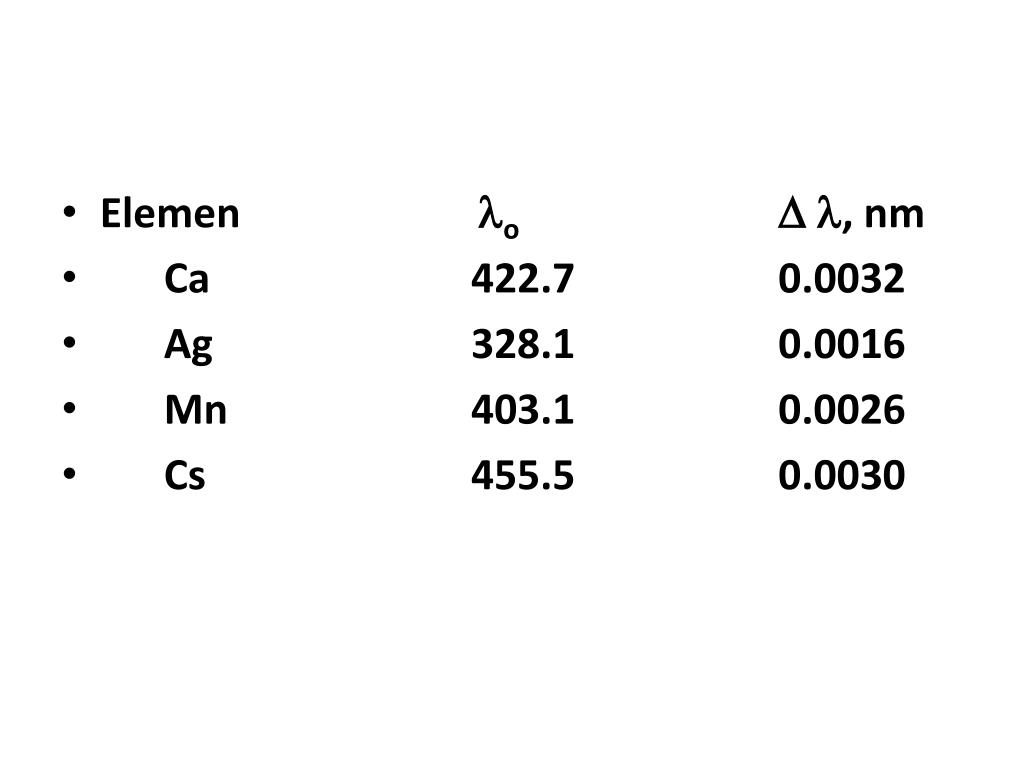 Elemeno , nm • Ca 422.7 0.0032 • Ag 328.1 0.0016 • Mn 403.1 0.0026 • Cs 455.5 0.0030