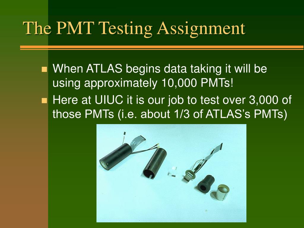 The PMT Testing Assignment • When ATLAS begins data taking it will be using approximately 10,000 PMTs! • Here at UIUC it is our job to test over 3,000 of those PMTs (i.e. about 1/3 of ATLAS’s PMTs)
