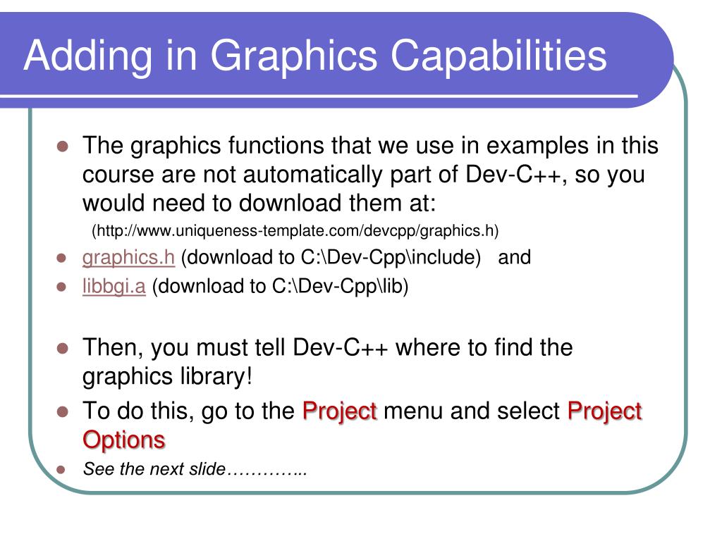 Adding in Graphics Capabilities • The graphics functions that we use in examples in this course are not automatically part of Dev-C++, so you would need to download them at: (http://www.uniqueness-template.com/devcpp/graphics.h) • graphics.h (download to C:\Dev-Cpp\include) and • libbgi.a (download to C:\Dev-Cpp\lib) • Then, you must tell Dev-C++ where to find the graphics library! • To do this, go to the Project menu and select Project Options • See the next slide…………..