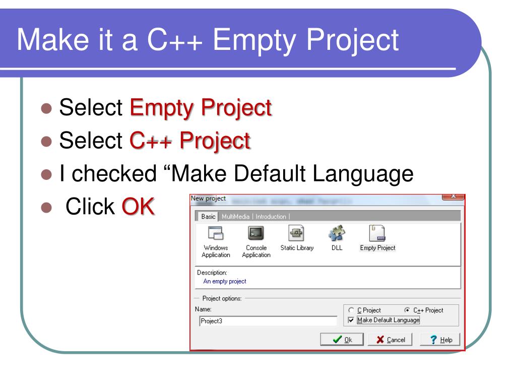 Make it a C++ Empty Project • Select Empty Project • Select C++ Project • I checked “Make Default Language • Click OK