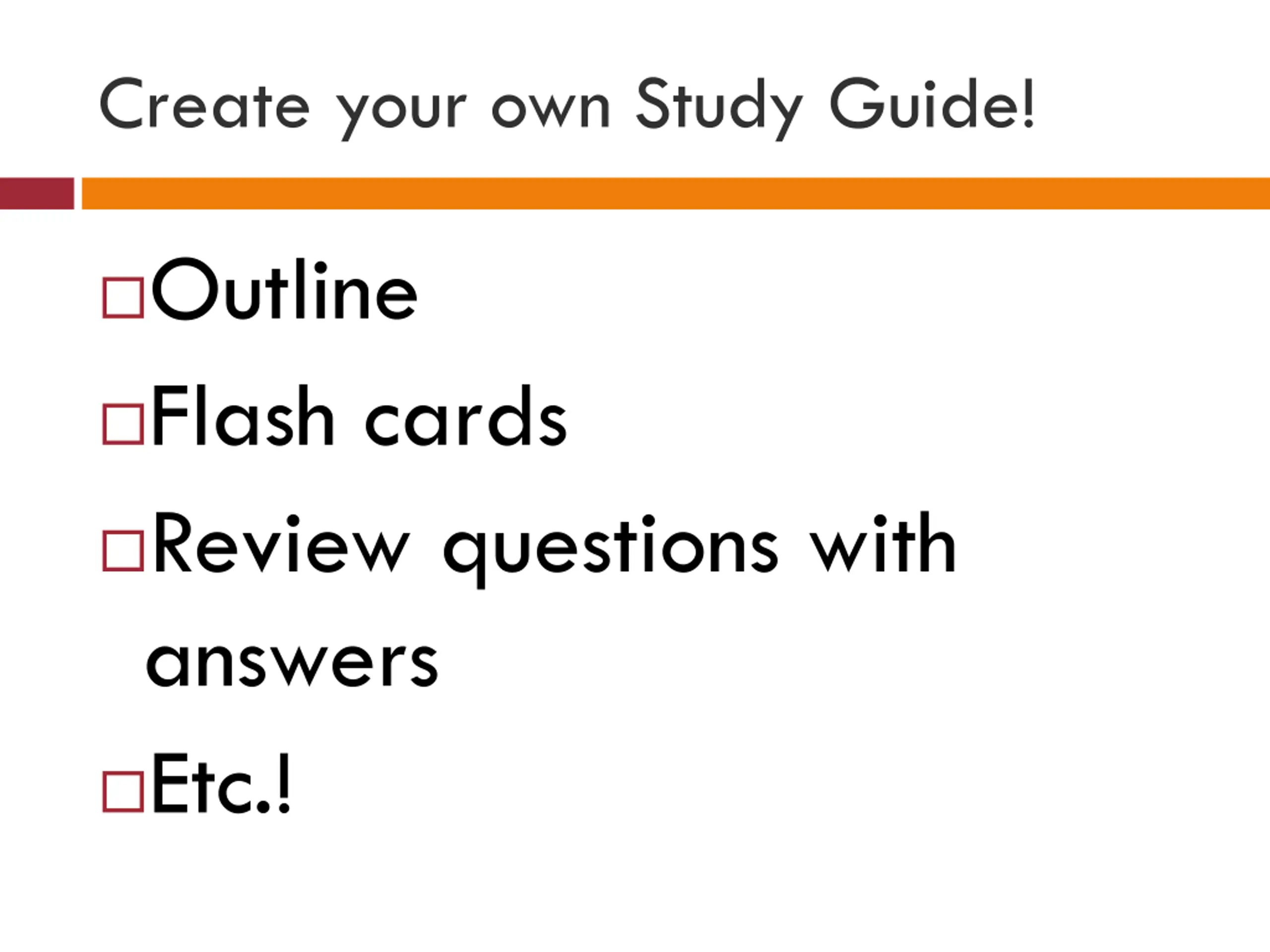 Create your own Study Guide! Outline Flash cards Review questions with answers Etc.!
