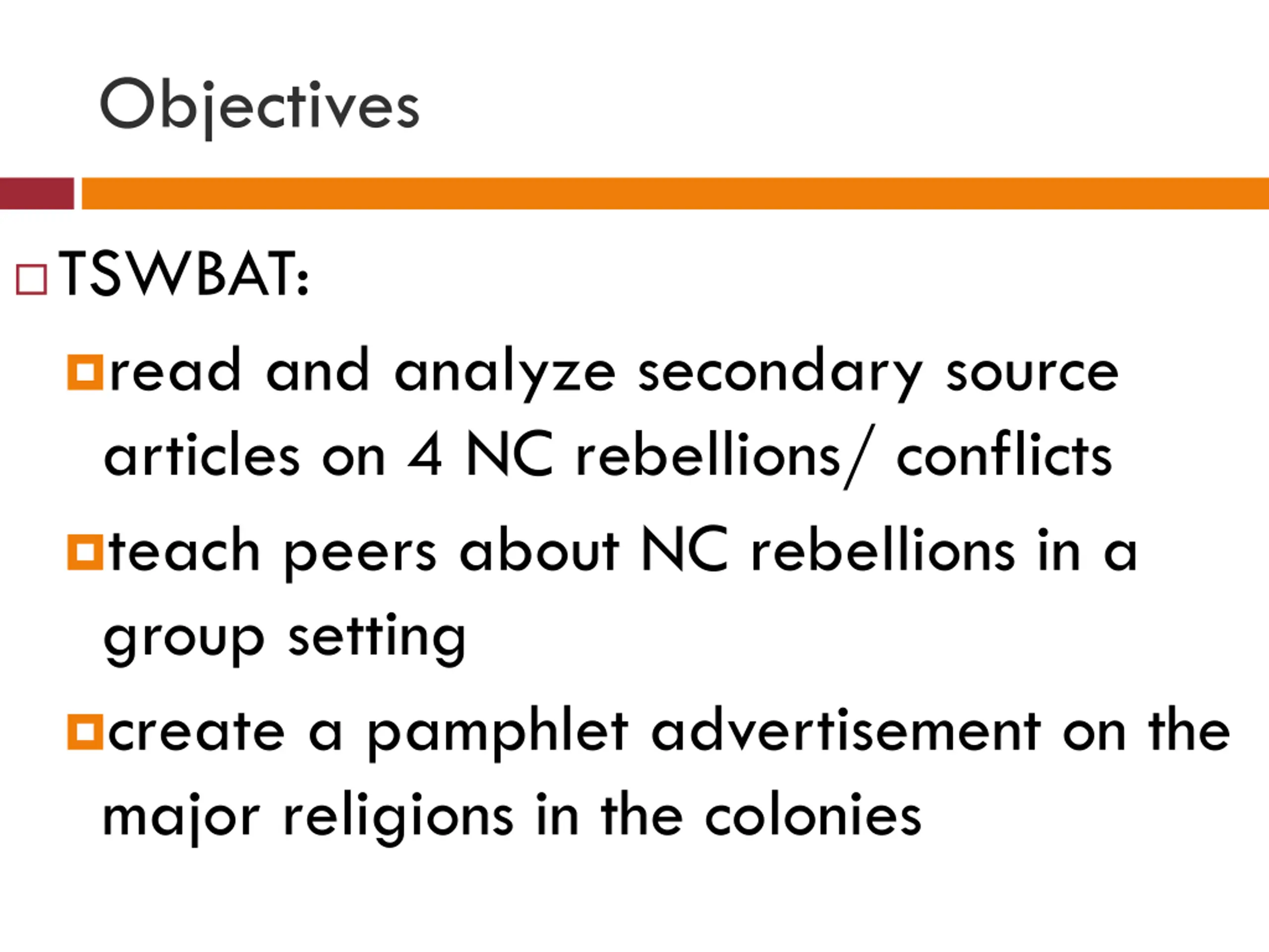 Objectives TSWBAT: read and analyze secondary source articles on 4 NC rebellions/ conflicts teach peers about NC rebellions in a group setting create a pamphlet advertisement on the major religions in the colonies