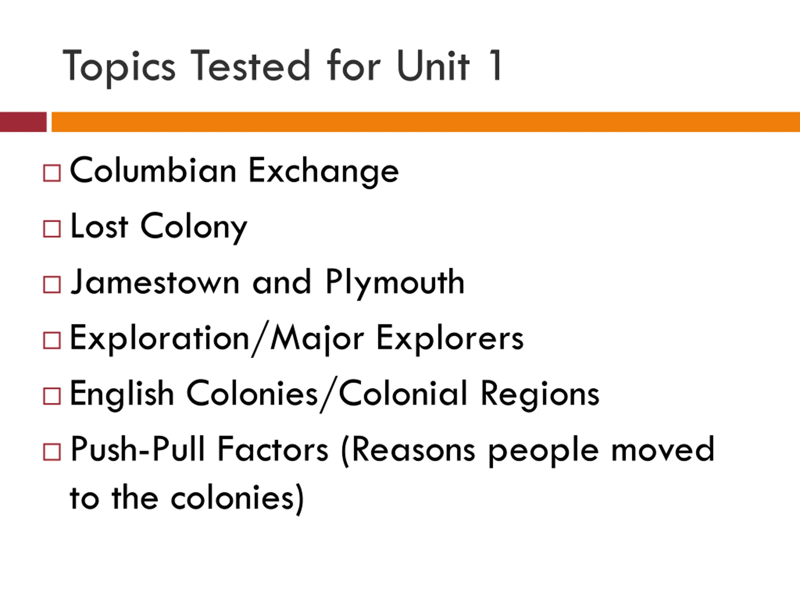 Topics Tested for Unit 1 Columbian Exchange Lost Colony Jamestown and Plymouth Exploration/Major Explorers English Colonies/Colonial Regions Push-Pull Factors (Reasons people moved to the colonies)