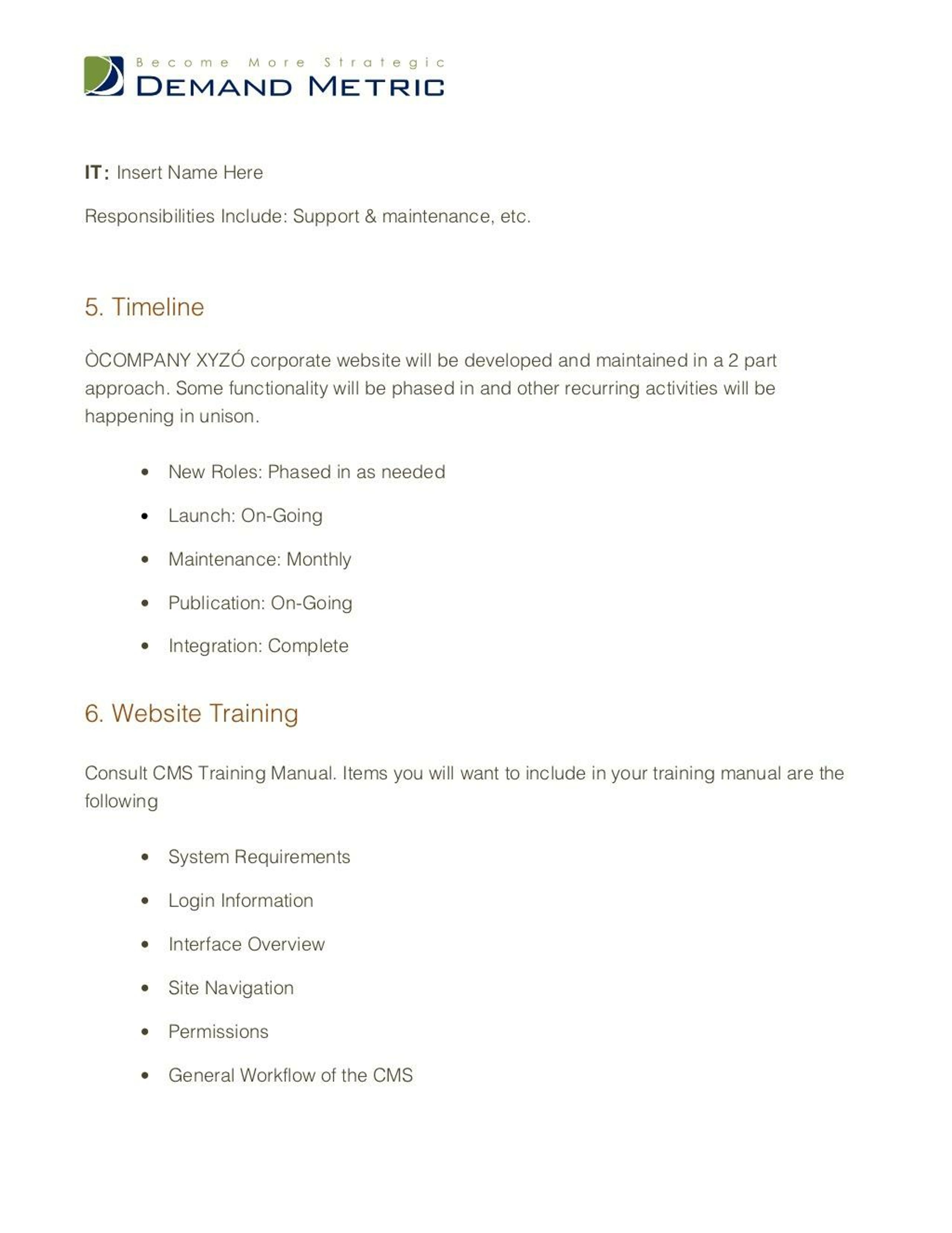 IT : Insert Name HereResponsibilities Include: Support & maintenance, etc.5. Timeline“COMPANY XYZ” corporate website will be developed and maintained in a 2 partapproach. Some functionality will be phased in and other recurring activities will behappening in unison. • New Roles: Phased in as needed • Launch: On-Going • Maintenance: Monthly • Publication: On-Going • Integration: Complete6. Website TrainingConsult CMS Training Manual. Items you will want to include in your training manual are thefollowing • System Requirements • Login Information • Interface Overview • Site Navigation • Permissions • General Workflow of the CMS IT : Insert Name HereResponsibilities Include: Support & maintenance, etc.5. Timeline“COMPANY XYZ” corporate website will be developed and maintained in a 2 partapproach. Some functionality will be phased in and other recurring activities will behappening in unison. • New Roles: Phased in as needed • Launch: On-Going • Maintenance: Monthly • Publication: On-Going • Integration: Complete6. Website TrainingConsult CMS Training Manual. Items you will want to include in your training manual are thefollowing • System Requirements • Login Information • Interface Overview • Site Navigation • Permissions • General Workflow of the CMS
