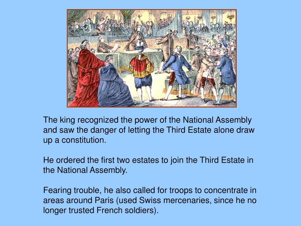 The king recognized the power of the National Assembly and saw the danger of letting the Third Estate alone draw up a constitution. He ordered the first two estates to join the Third Estate in the National Assembly. Fearing trouble, he also called for troops to concentrate in areas around Paris (used Swiss mercenaries, since he no longer trusted French soldiers).